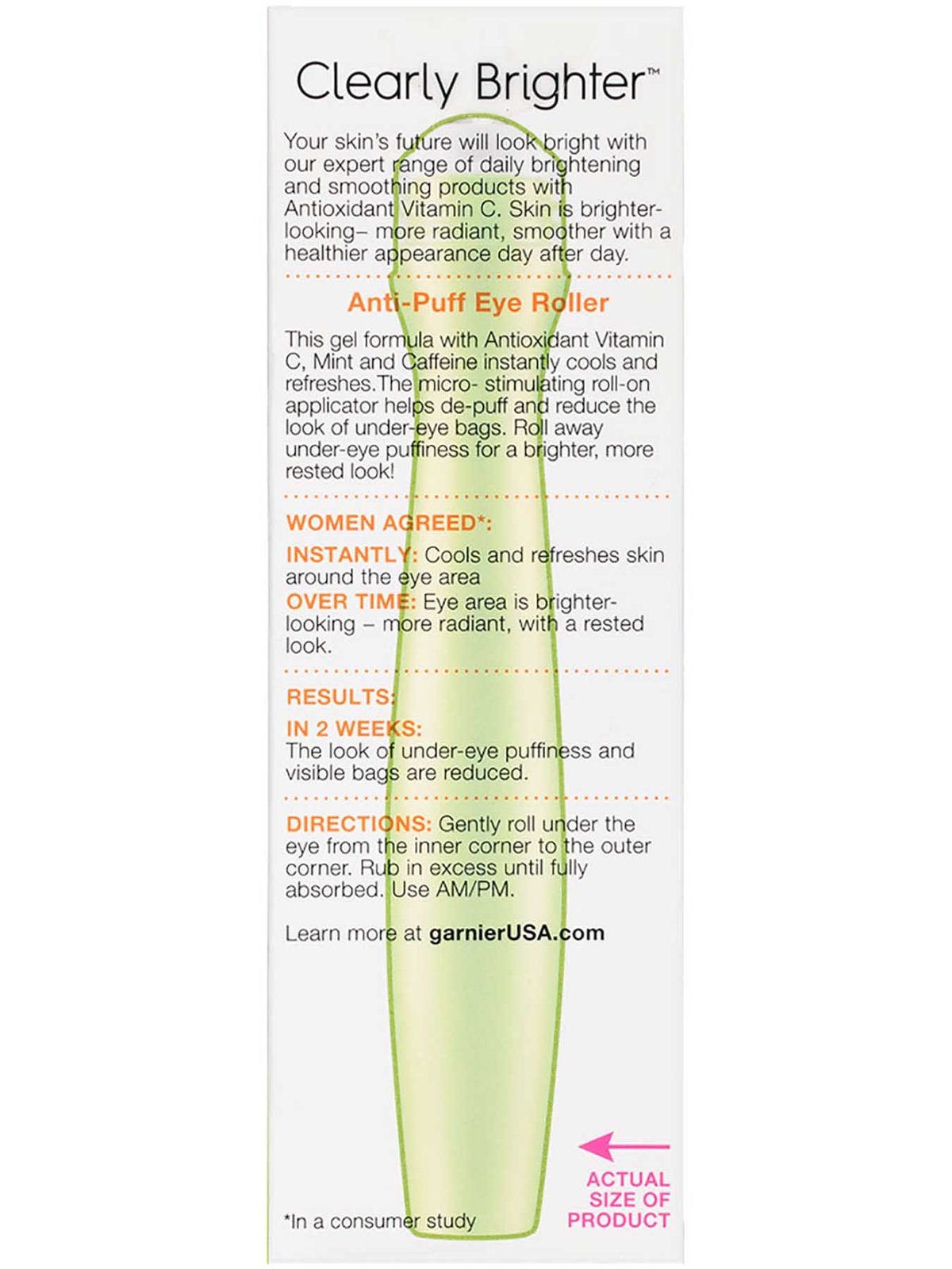 Clearly Brighter Anti-Puff Eye Roller এর প্রতিদিন ব্যবহারে চোখের নিচের ডার্ক সার্কেল ও ফোলাভাব দৃশ্যমানভাবে হ্রাস পায়। ক্যাফেইন প্রদাহ প্রতিরোধে সহায়তা করে এবং ভিটামিন C ত্বকে অ্যান্টিঅক্সিডেন্ট প্রভাব ফেলে। এটি চোখের অংশে পুষ্টি জোগায় এবং স্কিন টোন উন্নত করে।